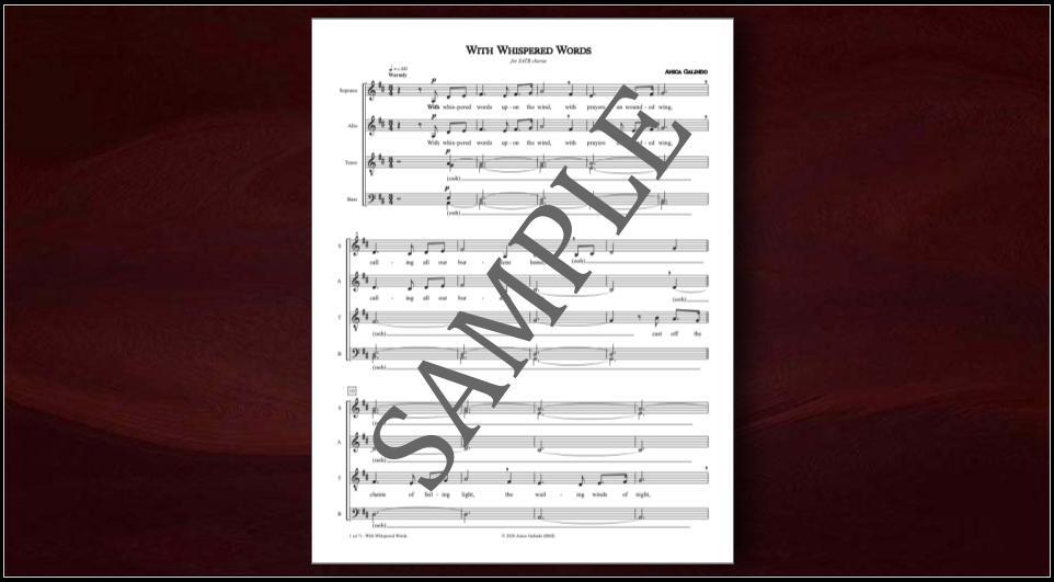 With Whispered Words, for SATB Chorus (PDF Score)$15$15https://schema.org/InStockusdAnica GalindoAnica GalindoWith Whispered Words, for SATB chorusPage dimensions: 8.5 x 11Duration: 4 minutesFull score, 7 pages (and 2 cover pages)*PDFs are stamped with buyer’s email.More information on this composition available here.© Anica Galindo and licensed by BMI. Buy thisSize459 KBLength9 pagesAdd to wishlist New wishlistShareShare on XShare on Facebook Copy linkCopy product URL
